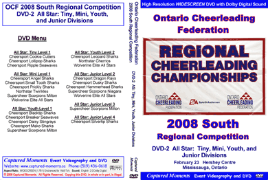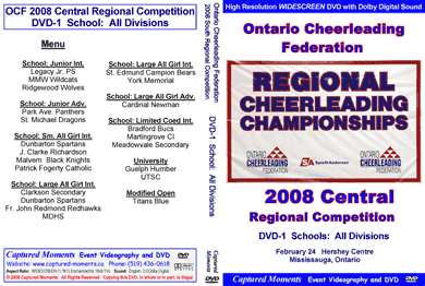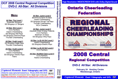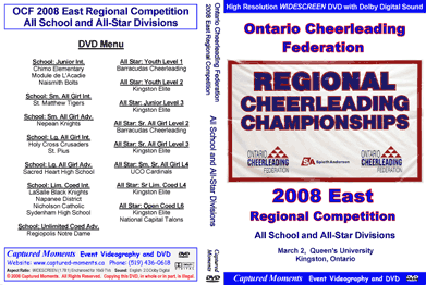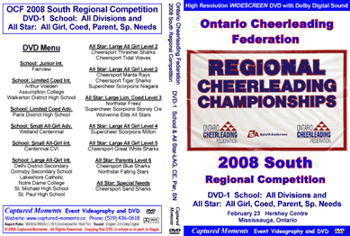 Listing of available Ontario Cheerleading Federation (OCF) Regional and Ontario Championship Event DVDs (2008 - 2004): (Click on the Links below for more information)